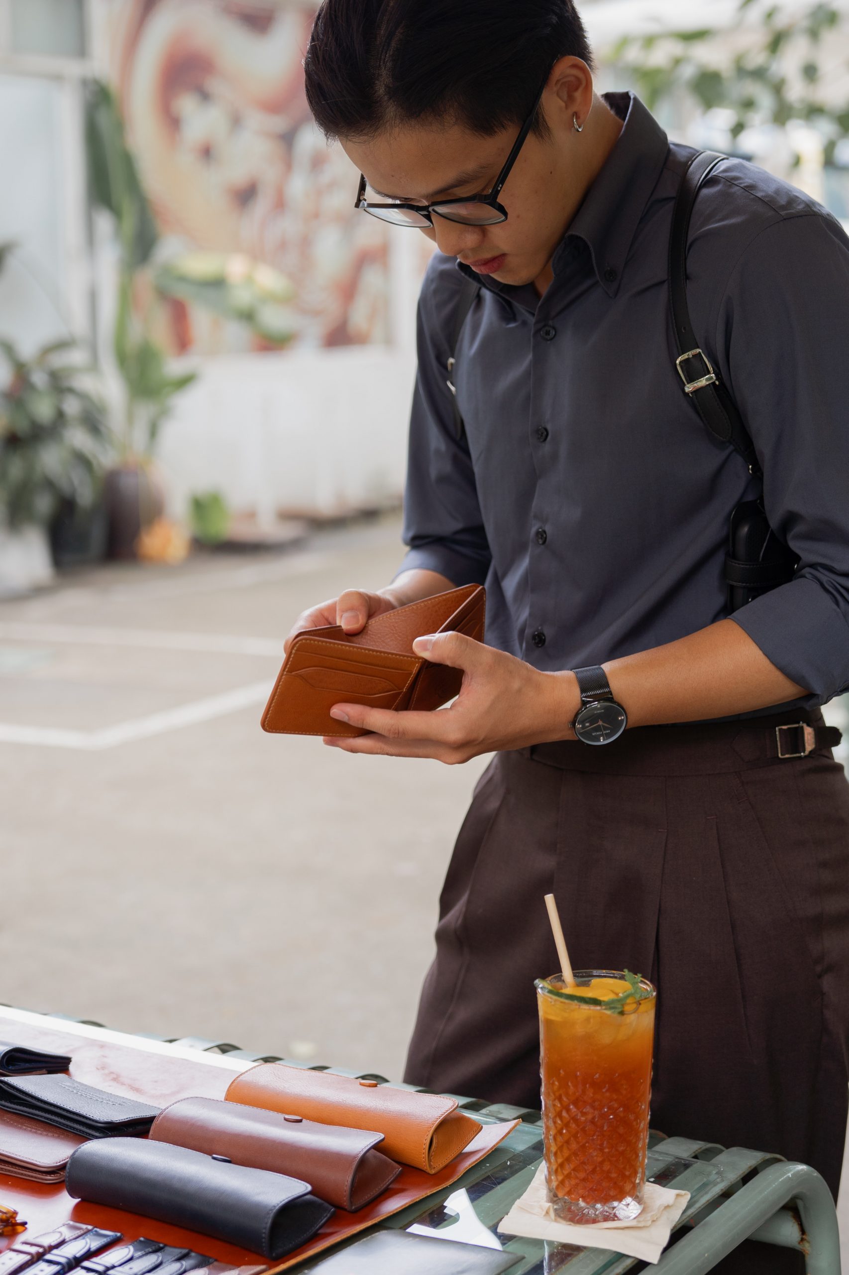 Bàn luận về câu hỏi “Phối phụ kiện da thế nào cho phù hợp trên tổng thể trang phục?”, Mr. Hà Lợi thường tuân thủ hai quy tắc chính: đồng chất liệu và đồng màu. Bởi mỗi chất liệu da có kết cấu bề mặt khác nhau, do đó tránh sử dụng nhiều phụ kiện có chất liệu khác nhau sẽ giúp outfit cân đối hơn; và điều này cũng áp dụng đồng thời với màu sắc. Những phụ kiện da tuy nhỏ như clutch, dây đồng hồ, bao kính… lúc này có sự liên kết, tạo nên điểm nhất tinh tế cho trang phục.